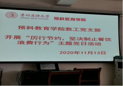2013年11月18日,中共中央、国务院印发了《党政机关厉行节约反对浪费条例》。习近平总书记作出重要指示,要求“坚决制止餐饮浪费行为”,“在全社会营造浪费可耻、节约为荣的氛围”。为了贯彻落实习近平总书记的重要指示精神,切实增强崇尚节约反对浪费的思想自觉,根据中共贵州民族大学委员会组织部“关于开展‘厉行节约坚决制止餐饮浪费行为’主题党日活动的通知”的要求,预科教育学院教工党支部于2020年11月13日下午在预科教育学院501会议室开展了“厉行节约坚决制止餐饮浪费行为”主题党日活动。