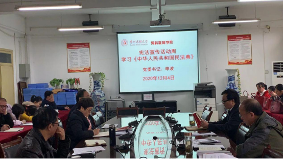 二、12月4日,学院党委组织全体教师在政治理论集中学习大会上学习了《中华人民共和国民法典》的部分章节,由学院党委书记申波领学。
