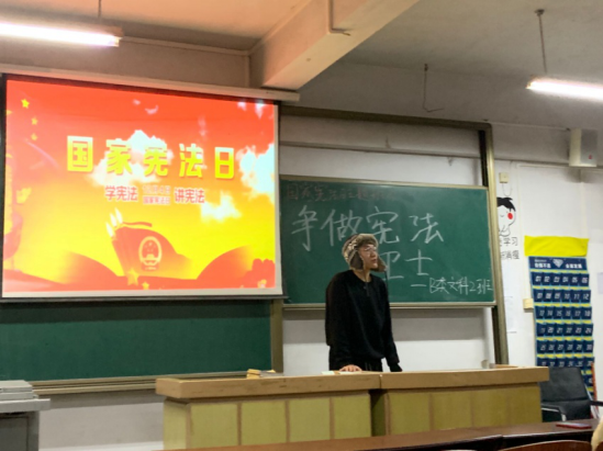 三、根据相关工作安排,组织各班同学积极开展“宪法晨读”活动,促进学习宪法的效果提升,着力培养学习宪法和尊重宪法的校园法治文化,营造学习宪法的良好氛围。